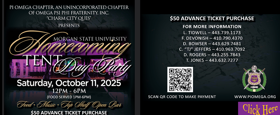 Featured Featured 12:00 pm - 6:00 pm Morgan State University Homecoming Tent Party (click here to purchase tickets)